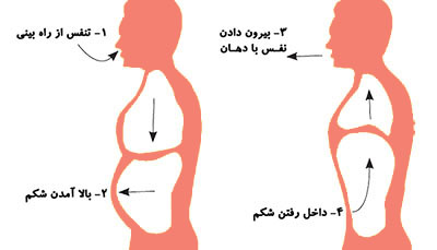 - همانطور که دست روی شکم با هر دم و بازدم بالا و پایین میآید توجه کنید که دست روی سینه تغییری نکند.